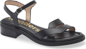 Overlapping leather straps cross the vamp of this ankle-strap sandal designed with a low block heel for a balanced lift.