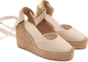 A jute-wrapped platform and integrated wedge heel amplify the boho aesthetic on a lofty espadrille featuring soft cotton ties that wrap around the ankle for a secure fit.