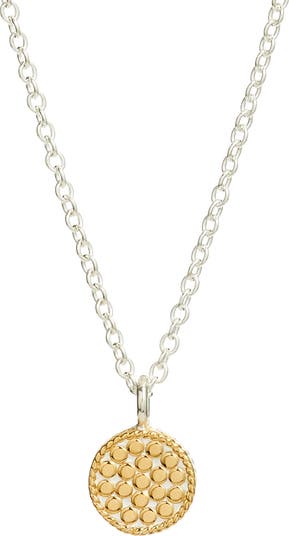 A handcrafted necklace displays a small sterling-silver disc plated in 18-karat gold on one side and textured with dots and braided trim.