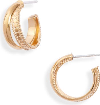 Sterling silver hoops plated in 18-karat gold feature two contrasting rows, one a polished dome and the other detailed with traditional Balinese patterns.