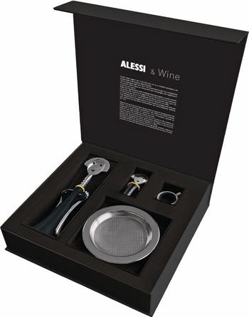 This wine gift set features a corkscrew shaped as a smiling woman, an Alessi icon, has been a bestseller since it was first produced in '94.