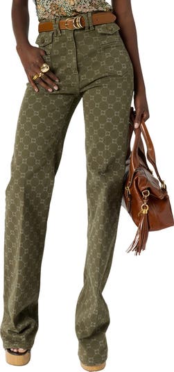 Anna jeans, one of Darel's signature pieces, featuring a monogram print in a chic military spirit. The high waist and flared legs elongate the silhouette.