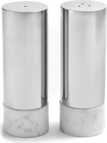 Elevate your dining experience with the sophisticated look of these salt and pepper shakers. Made from Carrara marble and stainless steel, these shakers are timelessly stylish and offer modern functionality with seasoning your food.