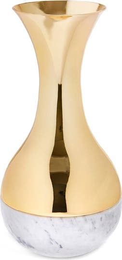 Elevate your home décor with a modern vase fashioned from shimmering plated steel supported by rich Italian Carrara marble.