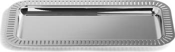 Serve appetizers, cocktails or an entrée on this stainless steel rectangular tray featuring a sleek, modern design inspired by the graceful lines of nature.