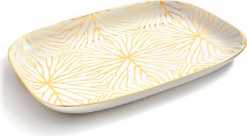 Tendrils and veins inspired by the Amazon's Giant Lily Pad shimmer in 24-karat gold against the milky ceramic of a serving platter that makes a distinctive presentation of everything from appetizers to main courses.