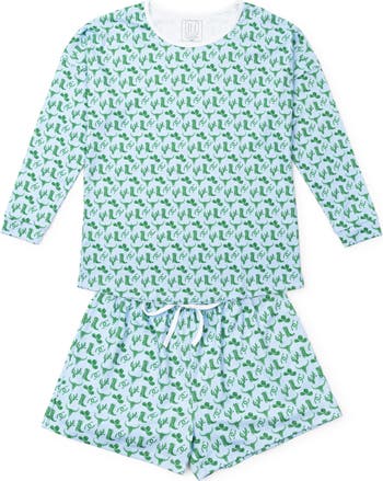 Top has white piping detail at neckline and cuffed sleeves, shorts have a drawstring waist. Made from 100% Peruvian Cotton.