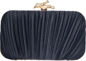 - Structured box silhouette for a polished profile I Soft pleated texture for dimension and refinement I Sculptural metallic clasp detail I Ideal size for phone, cards & essentials