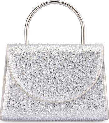 Lustrous crystals illuminate the structured exterior of an occasion-ready bag featuring an optional chain strap for easy hands-free wear.
