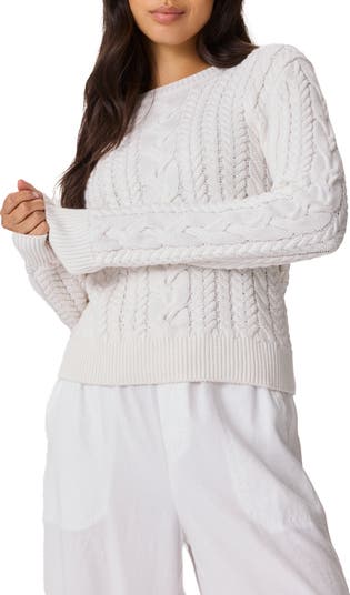 Mixed cables twist up and down a cotton-blend crewneck sweater that's a cozy wardrobe mainstay.
