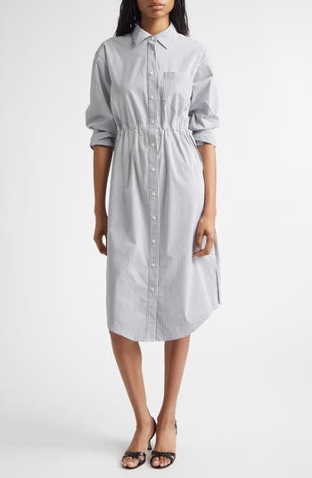 An elastic waist shapes the silhouette of this striped midi shirtdress cut from crisp stretch poplin and finished with a curved shirttail hem.
