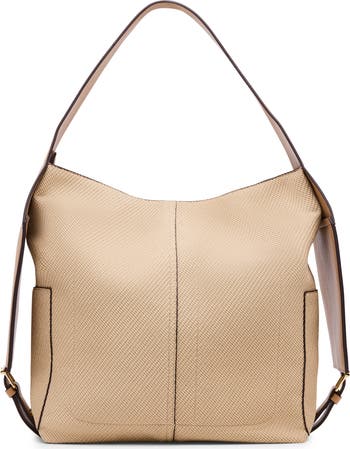 Channel modern sophistication in this mixed-media shoulder bag featuring smooth faux-leather trim to contrast with the textured woven fabric.