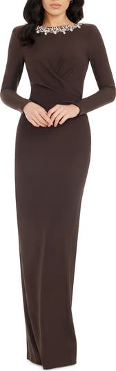Embellishment details along the neck and back dance in the light as you make your grand entrace in this floor-length column gown.
