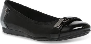 Logo-accented hardware makes a signature statement on a versatile flat grounded by a cushioned footbed for comfortable wear.