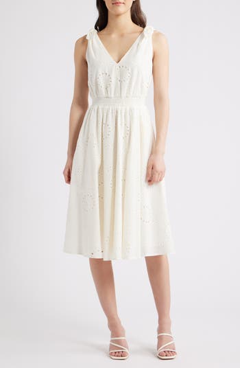 So simple, summery and chic, this sundress styled from cotton eyelet features bow-tied shoulder straps and a waist-defining smocked waist.