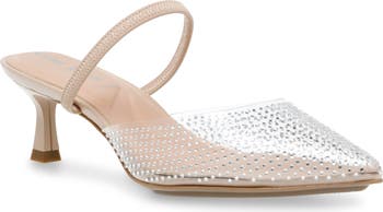Sparkling crystals accentuate the pointy toe of an outfit-making slingback set on a lightweight and flexible sole.