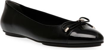 A gleaming charm details the delicate bow on a poised ballet flat fashioned with a cap toe for contemporary appeal.