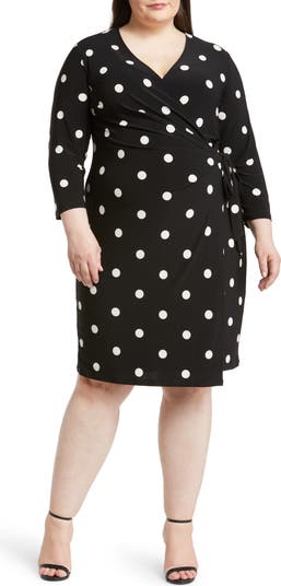 Oversized polka dots dance atop a stretch-kissed wrap dress that easily transitions from the office to date night.