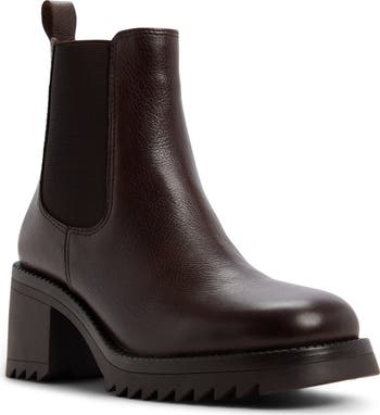 A subtle platform and chunky block heel add walkable height to a square-toe Chelsea boot featuring a lightly textured leather upper. A dual-density foam footbed and durable sawtooth sole provide comfort and stability.