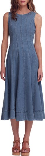 Paneled to flatter, this sleeveless denim midi gives a modern spin to the classic fit-and-flare dress. The bodice skims and the skirt softly sways to a mid-calf finish, while a hint of stretch keeps it comfortable for every occasion. Add a pop of color with a silk scarf and ground the look with loafers for effortless polish.