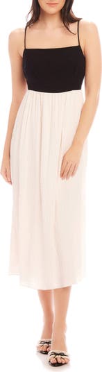 Build out your black-and-white collection with a summery dress that offers a smooth knit bodice and a textured woven skirt.