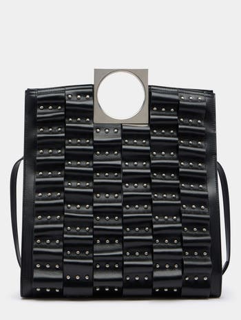This Anni tote is constructed in fine black calfskin and embellished by undulating leather details affixed via small round studs. A geometric handle in metal offers hand carry, or this versatile piece can be folded and slung over the shoulder.