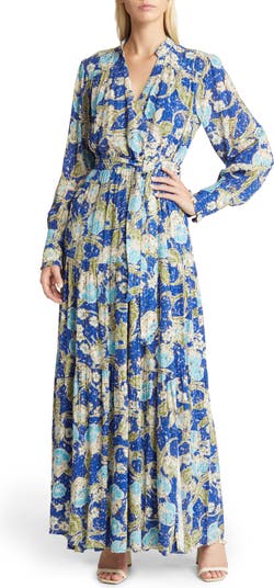 A surplice V-neck adds a grace note to a flower-filled maxi wrap dress that needs to be both added to your packing list and included in your in-town plans.