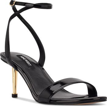 A slender heel with a golden finish steals the show in this strappy sandal that elevates any look.