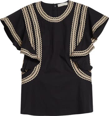 Anora Rickrack Trim Cotton Flutter Sleeve Top
