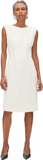 A tea length sleeveless dress crafted in tweed, featuring graphic stitching and seaming details and a nipped waist. Fully lined. Only about 1.4% of all cotton grown globally is organic. We support organic agriculture because it protects our land’s natural ecosystems by banning harmful chemicals, synthetic pesticides, and GMO seeds.