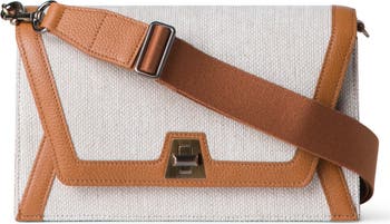 A quietly luxe bag in a compact size is crafted from linen-lightened canvas with calfskin-leather trim and features the brand's iconic trapezoid shape—from closure plate to silhouette.
