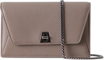 A signature trapezoidal turnlock—which subtly references the 'A' in Akris—is echoed in the flap of this richly grained goatskin-leather envelope bag. You can carry this compact style as a clutch or attach the chain strap for a hands-free option.