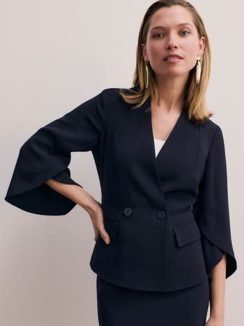 The Clever Crepe Ansdell is the epitome of statement tailoring. Neat, darted shoulders are balanced by flared sleeves with rounded cuffs, while its double-breasted fastening cinches at the waist.