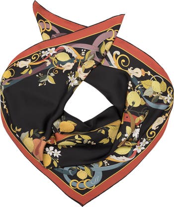 This floral wreath pattern with Mediterranean citrus fruits and pomegranates is a timeless symbol of natural beauty and feminine charm, which is how this scarf will make you feel.
