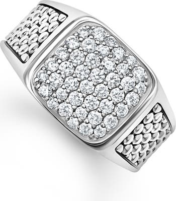 Signature Caviar beading flanks the sides of this sterling silver signet ring illuminated by a pavé diamond face.