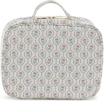Our TRVL2 Cosmetic Case - a larger design and new interior made in vegan Saffiano exterior and our new navy pinstripe interior with clear wipeable overlay. Featuring a large interior compartment with a zip pocket in the lid, a two-way zip around closure, 3 removable pouches inside, chic gold hardware, and a double top handle for grab and go TRVL. Lined in a Chic stripe cotton with clear overlay, 3 removable pouches (two matching leather and one in clear ) - perfect extra storage for your jewelry or beauty extras.