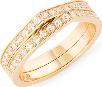 This statement ring is composed of two rows of 18-karat gold, sparkling with pavé diamonds, and is handcrafted using the technique of lost-wax casting. It features a minimalist and architectural design that blends soft curves and sharp angles, inspired by the shape of the cliffs of Antifer in Normandy.