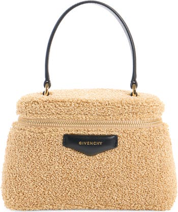 This vanity case–inspired version of the Antigona satchel is made in a compact silhouette from raffia—woven in a way that gives it a shearling-like texture—and folded with the style's origami-inspired gussets.