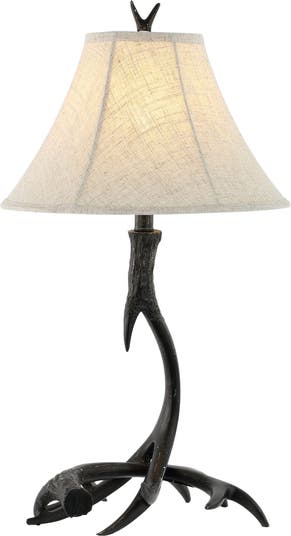 Create a classic lodge feel in your home with this rustic table lamp. Featuring a faux antler base, this nature-inspired lamp is beautifully rugged and artistic. The natural linen drum shade diffuses the light for a soft, warm cabin glow.