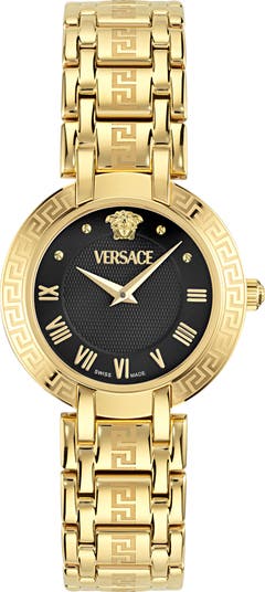 The brand's Greek key motif echoes around the topring and highlights the black guilloche dial on this elegant Swiss-made watch punctuated with an iconic 3D Medusa head and set on an opulent bracelet.