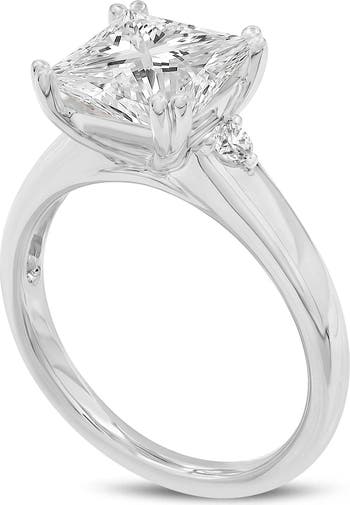 This 3 carat princess cut lab grown diamond ring is a showstopper. The ring is encased in a beautifully crafted 14K gold prong setting with round cut lab grown side diamonds. Perfect f or special occasions including weddings and engagements. The ring is accompanied with an IGI certificate with the certificate number inscribed within the band. Diamond carat weight may fluctuate 0.05 carats ABOVE the stated number.