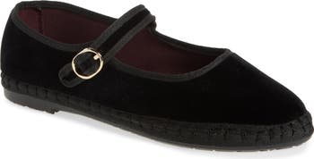 A cotton velvet upper adds timeless sophistication to a mary jane flat designed with an antibacterial interior and grounded by a rubber sole produced from recycled bicycle tires.