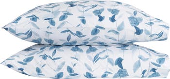 Upgrade your bedding ensemble with the soft, luxurious touch of Egyptian-cotton percale pillowcases decorated with painterly leaves in watercolor hues.