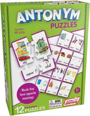 Antonyms are words that have opposite meanings (such as hot and cold). Piece together opposite words with their matching pictures, in this self-correcting puzzle, to create a completed card. Contains 48 pieces. Ages 5+