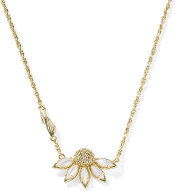 Pavé crystals cluster at the center of this flower pendant necklace framed by opalescent petals and suspended from a fine 14-karat-gold-plated chain.