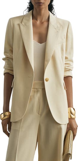 Pickstitching traces the peaked lapels of a desk-to-dinner jacket cut from a luxe blend of silk and wool.