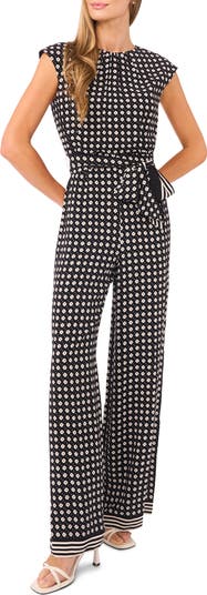 A matching sash cinches the waist for defining shape in this neat-print jumpsuit designed with a gathered neckline and dramatic wide legs.