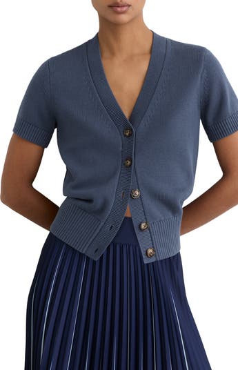 Wool-enriched cotton yarns bring warmth and coziness to this short-sleeve cardigan anchored by soft ribbing.