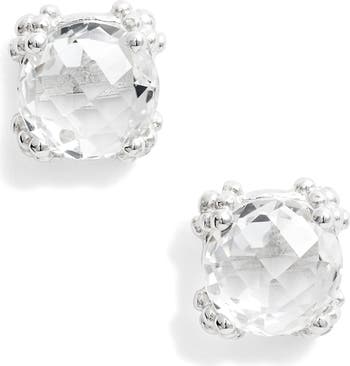 Beaded clusters corner glittering white topaz stones on these modern earrings handmade and hand-polished in Canada.