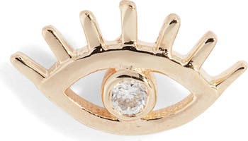 A bezel-set diamond beams from the center of this eye stud earring handmade from 14-karat gold.